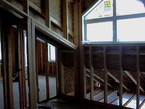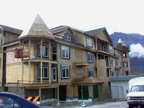 Looks pretty much like the artist's conception in the sales documentation. The dormer in the picture above is Mountain Time's guest bedroom window in the picture below. The picture below is taken from the guest bedroom. You can see a corner of the living room window, part of the balcony door, and, on the extreme left, part of the master bedroom window. First look at the inside
